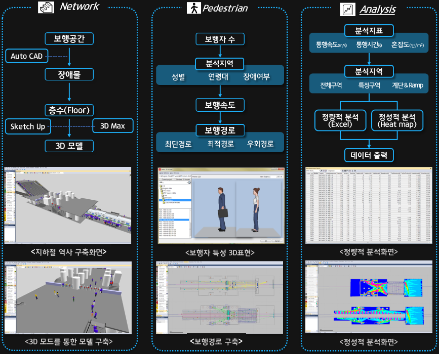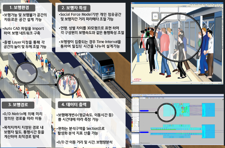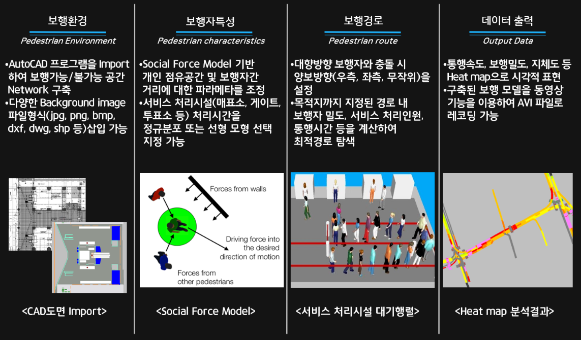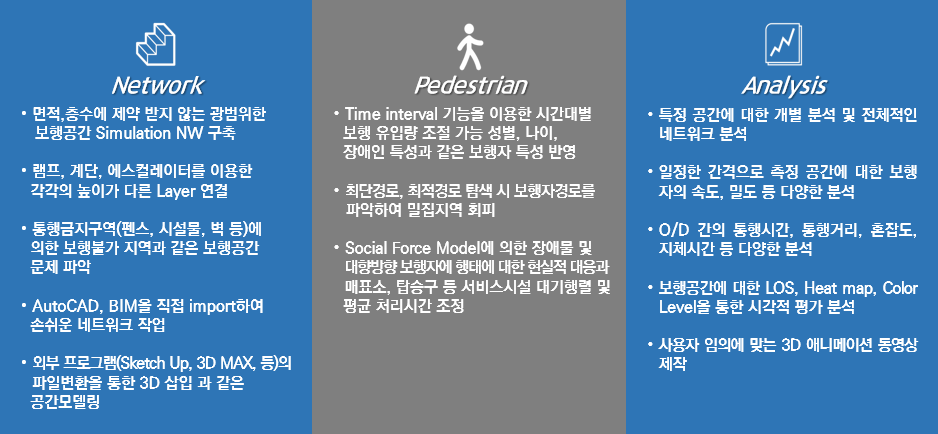 보행공간, 장애물, 층수, 3D모형 등으로 구축된 네트워크 내에 보행자의 특성(속도, 경로정보 등)을 입력한 뒤 다양한 분석지표(통행속도, 통행시간, 혼잡도 등) 선택 및 분석지역을 설정하여 분석이 진행됨. |