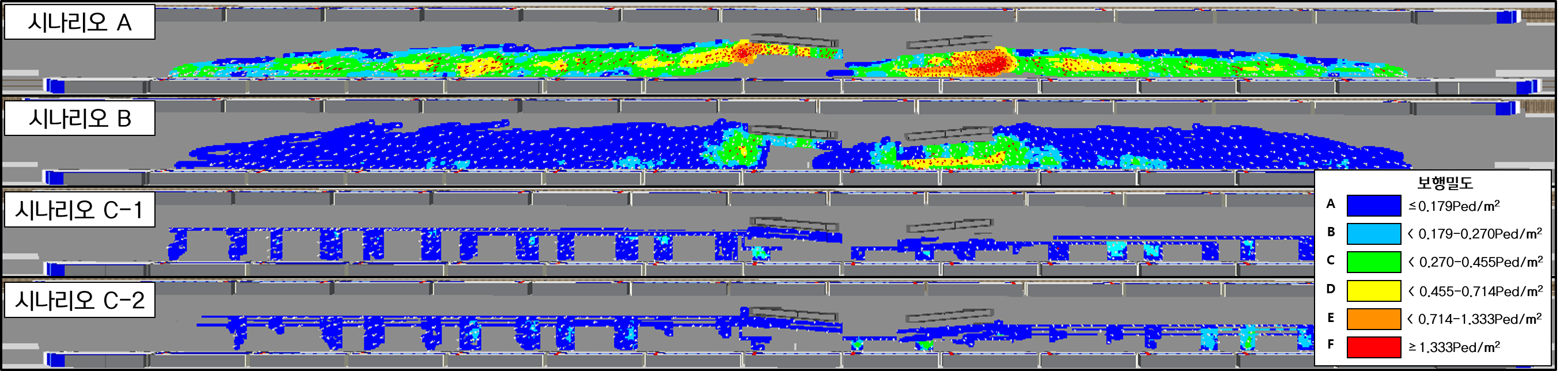 - Scenario C-2, constructed with 3 lines of pedestrian lines, is analyzed to have the lowest pedestrian density among the scenarios, but in the case of constructing a pedestrian line with 3 lines, the pedestrian's transverse separation distance does not satisfy the “social distance”. Suitability is considered invalid
